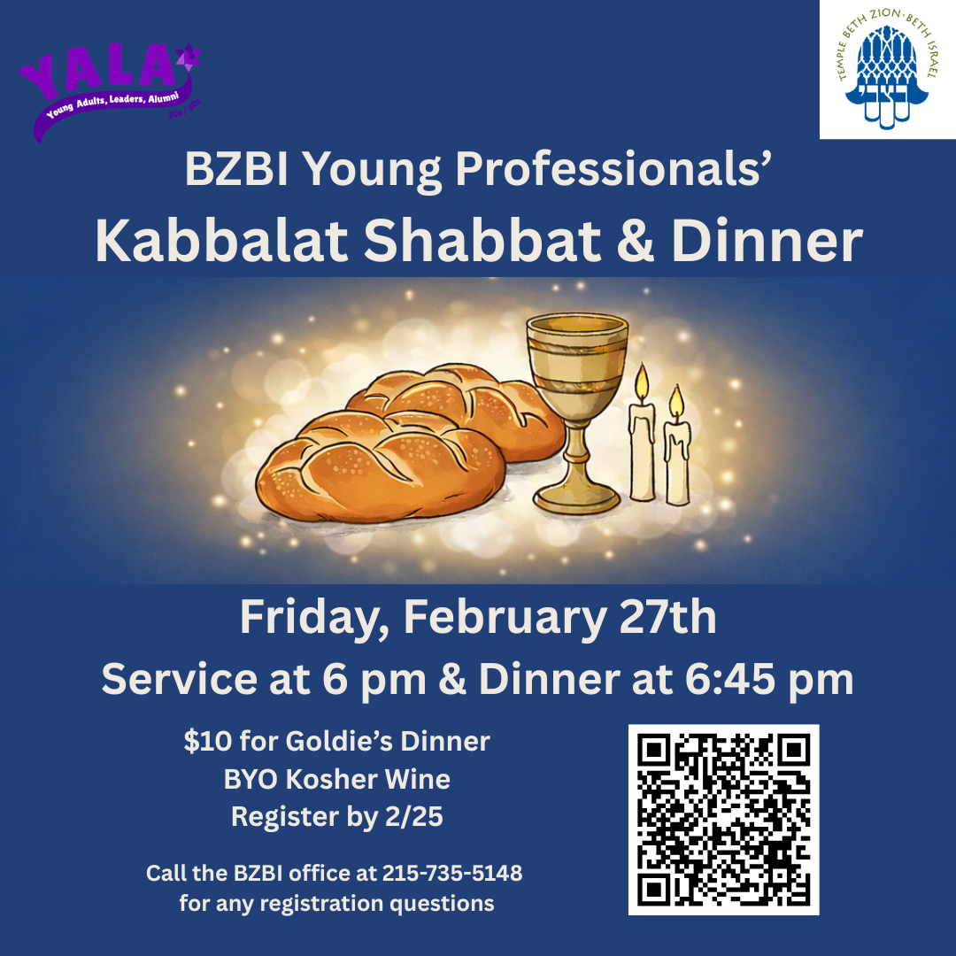 Join BZBI's Young Professionals group for Kabbalat Shabbat Services led by Rabbi Kenneth A. Stern and Goldie dinner afterwards! Click here to register. For questions or to learn more about our Young Professionals group - contact Hope Wright at BZBIYoungProfessionals@gmail.com.